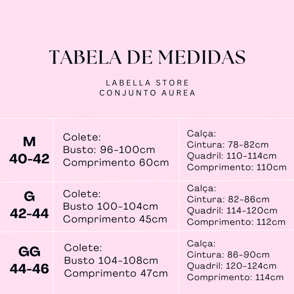 Elegância contemporânea, conforto absoluto e sofisticação definem o Conjunto Áurea. Com design minimalista e alfaiataria moderna, o modelo valoriza a silhueta com caimento impecável e visual refinado. Nossa modelo Vanessa veste P: Altura 1.62 | Busto 98 | Cintura 81 | Quadril 109