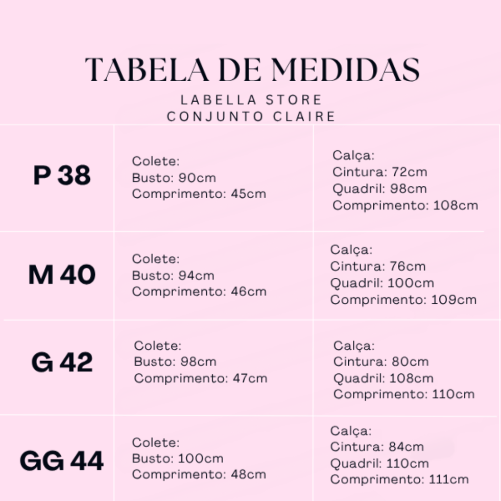 Composto por um colete de modelagem alfaiataria e uma calça reta de cintura média, o conjunto valoriza a silhueta de forma leve e sofisticada. O colete possui gola lapela e fechamento frontal por botões, trazendo um toque clássico e refinado. Já a calça oferece caimento perfeito, proporcionando liberdade de movimento e um visual alinhado.