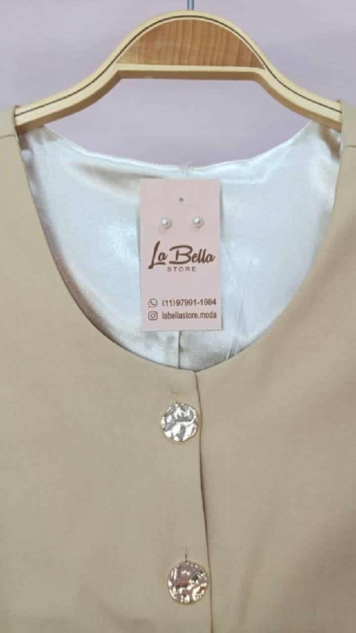 Colete alongado: Com fechamento frontal por botões, que ganham destaque com detalhes dourados, agregando charme e estilo à peça.