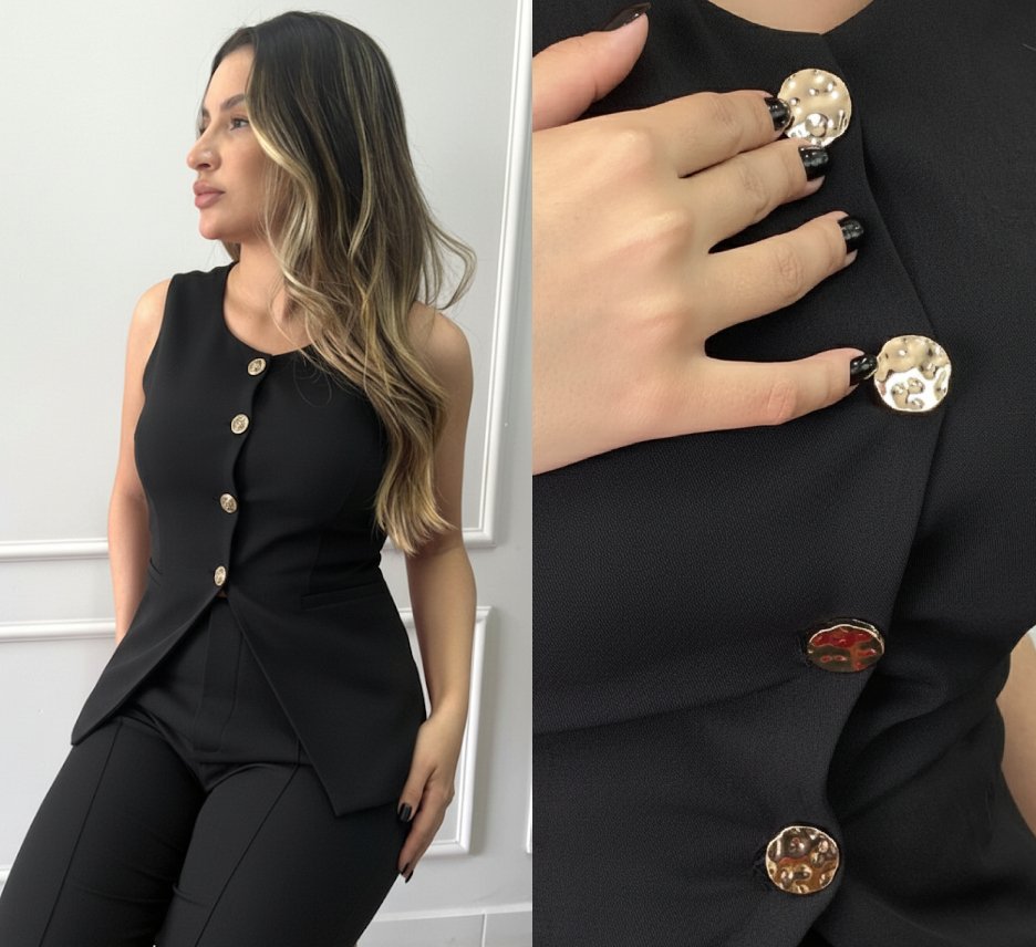 Colete alongado: Com fechamento frontal por botões, que ganham destaque com detalhes dourados, agregando charme e estilo à peça.