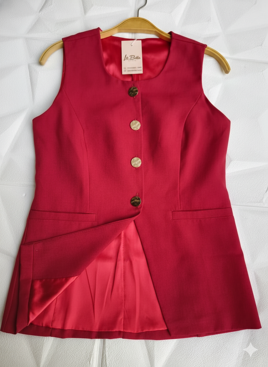 Colete alongado: Com fechamento frontal por botões, que ganham destaque com detalhes dourados, agregando charme e estilo à peça.
