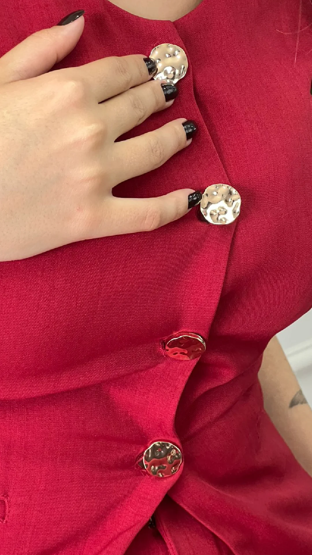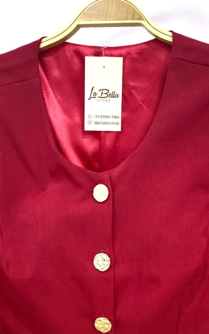 Os botões metalizados com efeito martelado trazem um charme exclusivo, agregando sofisticação e um toque de luxo à peça.