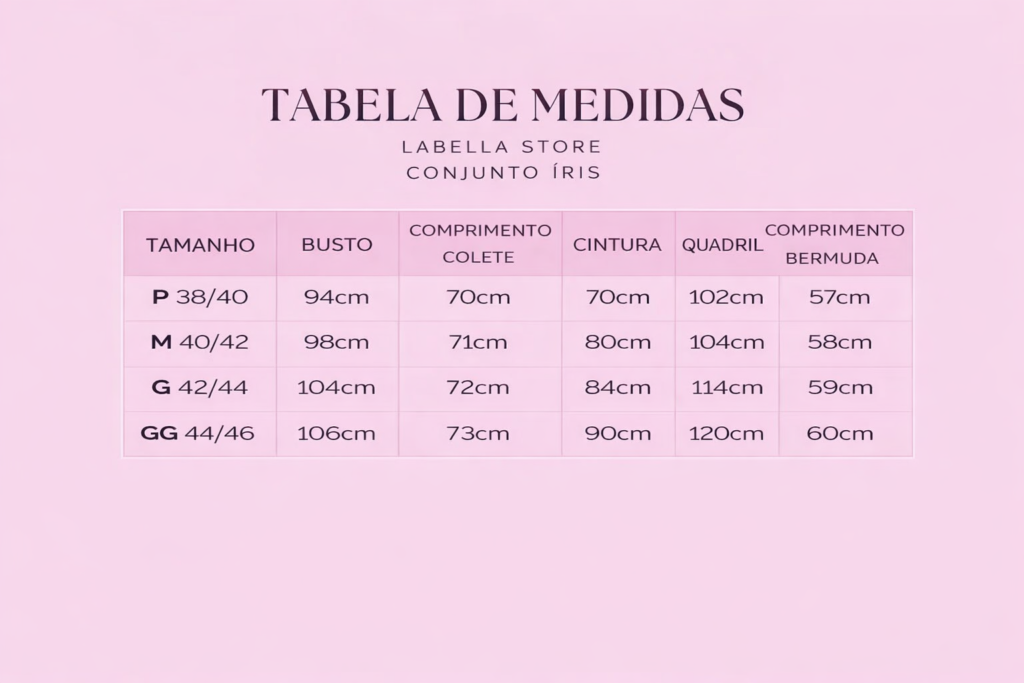 Descubra o equilíbrio perfeito entre elegância e conforto com este conjunto íris. Confeccionado com tecido de alta qualidade (95% poliéster e 5% elastano), ele oferece um toque macio, leve elasticidade e um caimento impecável que valoriza a silhueta com sofisticação.