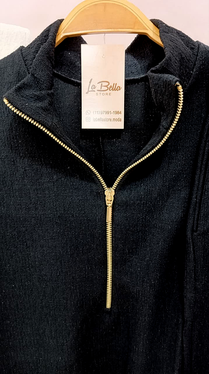 Gola estilo polo com zíper funcional, que permite variações de uso (mais fechado para um look clássico ou aberto para visual despojado).
