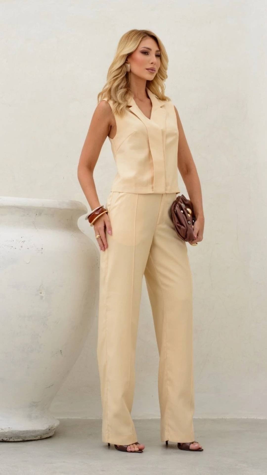 A blusa com pala frontal traz um recorte estruturado e moderno, enquanto a calça de alfaiataria com fechamento em zíper e botão garante um visual refinado e versátil. Ideal para quem busca um look elegante e atual — perfeito para transitar do dia ao noite com naturalidade.