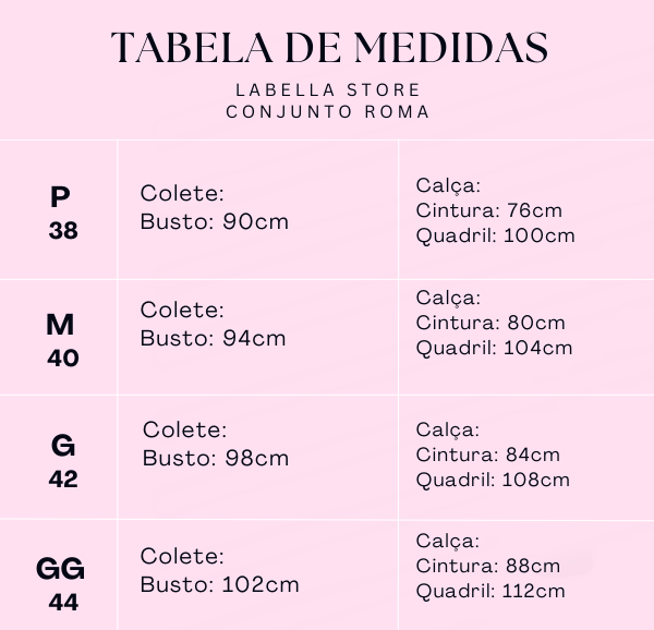 MEDIDAS: Tamanhos: P 38 / M 40 / G 42 / GG 44