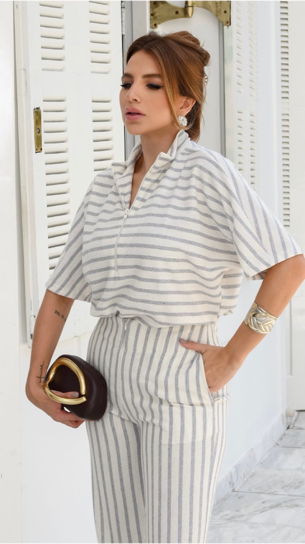 A blusa possui modelagem reta com mangas amplas e caimento solto, que proporcionam leveza e modernidade ao visual. O detalhe de gola alta com zíper frontal traz um toque esportivo-chic, perfeito para produções casuais com informação de moda. As listras horizontais em tons neutros adicionam um charme descomplicado à peça.