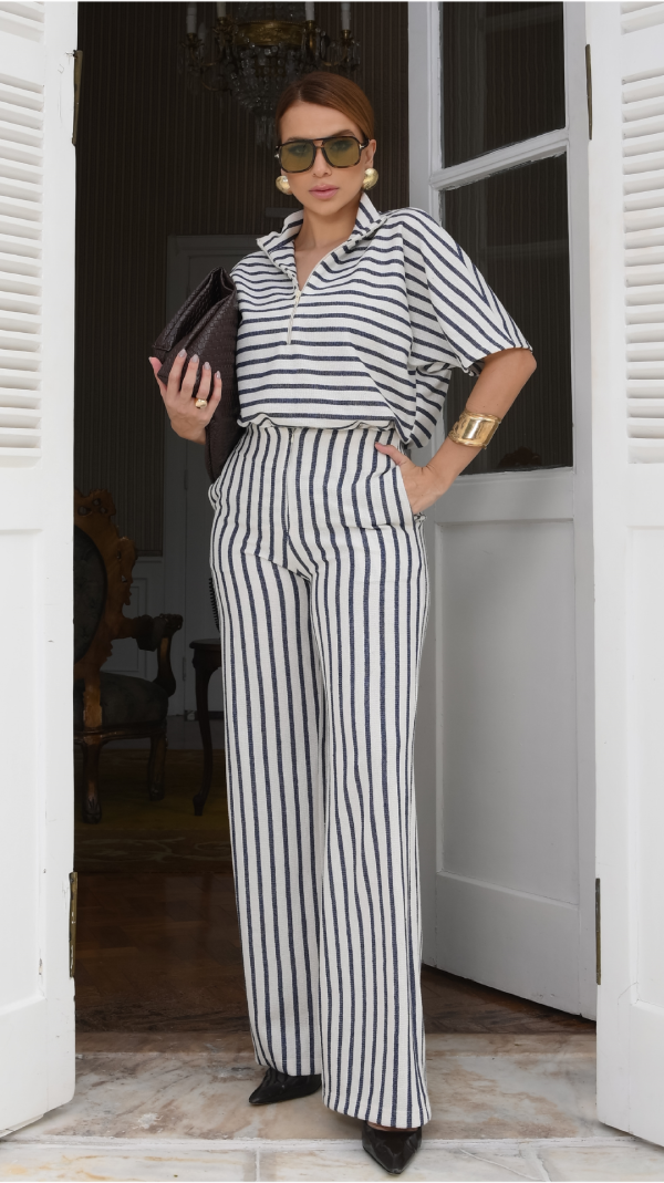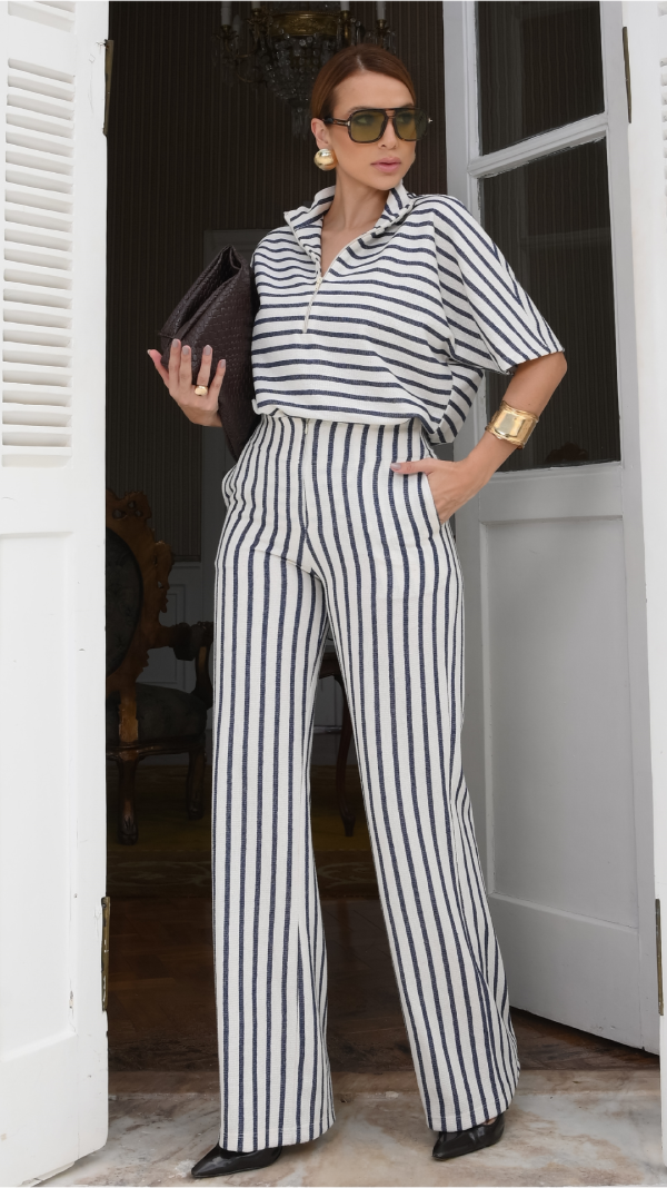 A calça, com listras verticais que alongam a silhueta, tem modelagem reta e cintura média, conferindo elegância sem abrir mão do conforto. O tricozinho garante estrutura e flexibilidade, tornando a peça ideal para o uso diário, seja no trabalho ou em momentos de lazer.