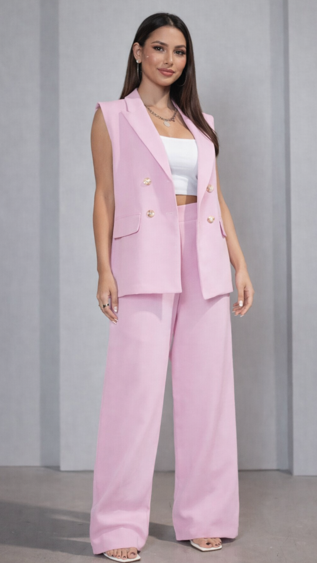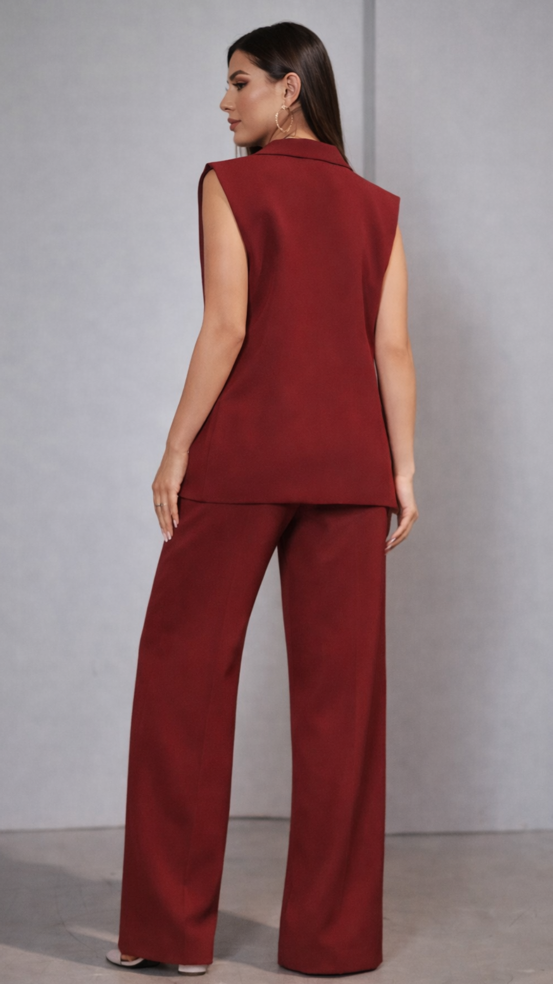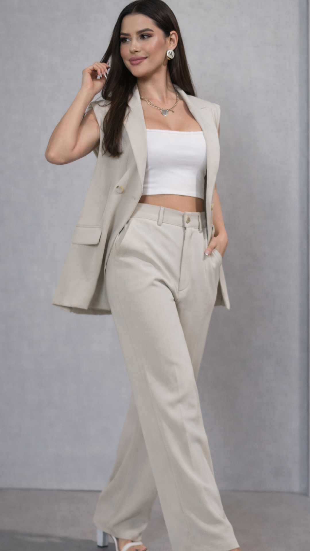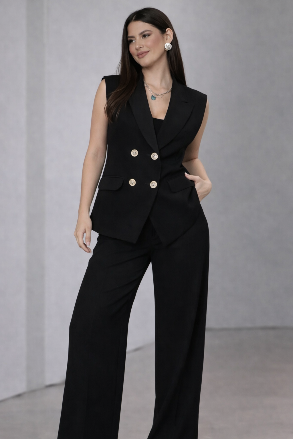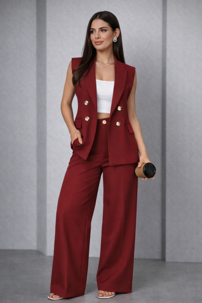 O colete com corte impecável, valoriza a silhueta e traz um ar moderno e poderoso. A calça de modelagem ampla alonga as pernas, garantindo um caimento elegante, confortável e extremamente atual.