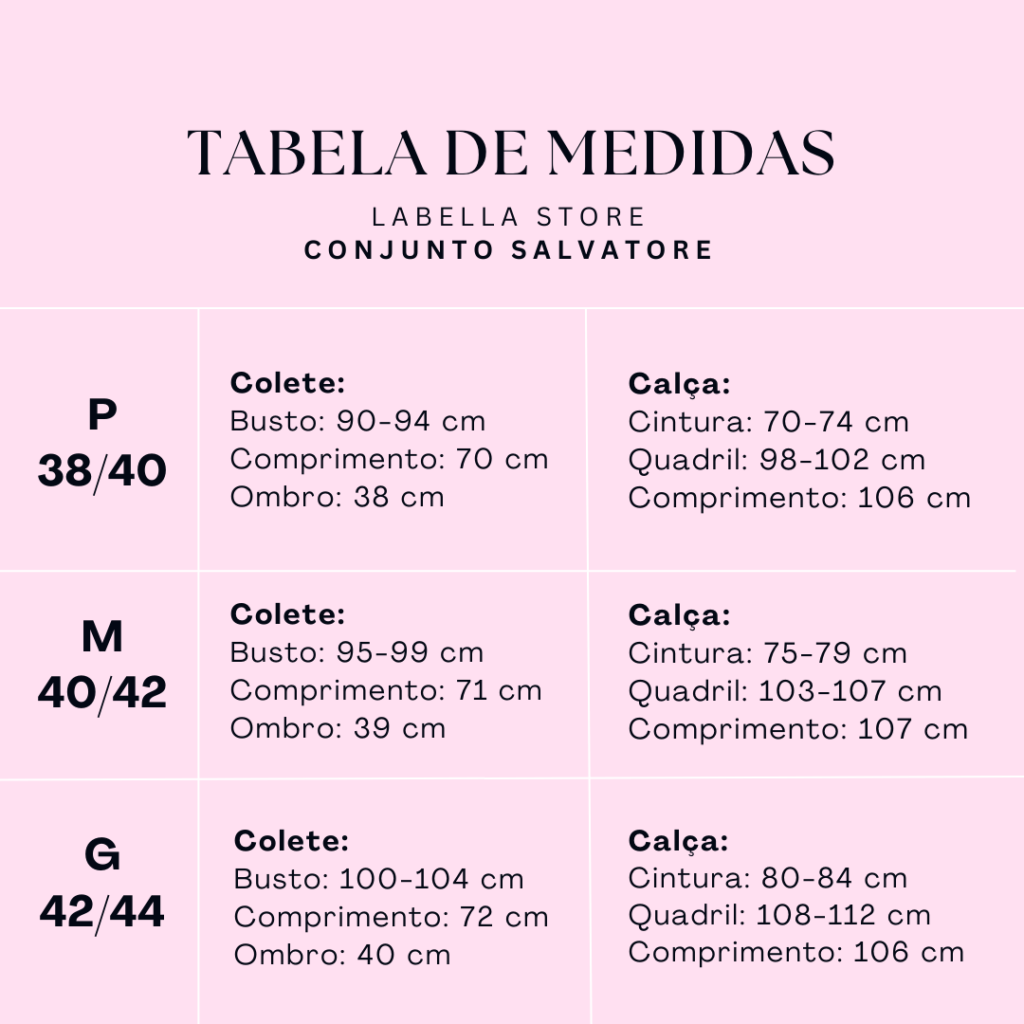 Tamanhos: P 38-40 / M 40-42 / G 42-44