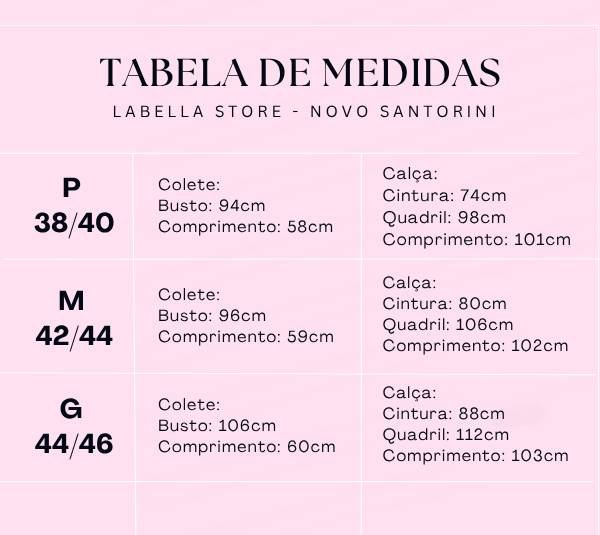 Com um caimento impecável e detalhes sofisticados, o novo Conjunto Santorini traz elegância e modernidade para suas produções. Uma escolha versátil e atemporal para mulheres que valorizam estilo e sofisticação. Nossa modelo Larissa veste P: Altura 1,72 | Cintura 65 | Quadril 102 | Busto 85